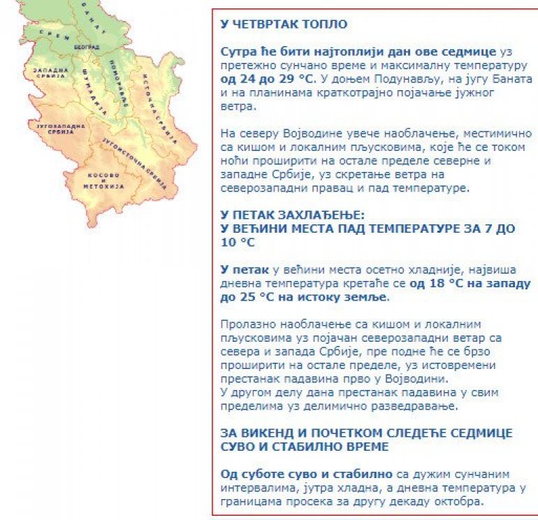 У петак у већини места осетно хладније, највиша дневна температура кретаће се од 18 °С на западу до 25 °С на истоку земље.