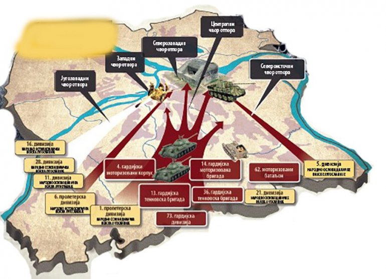 ПЛАН НАПАДА на Београд одступао је од уобичајених освајања великих градова, када се прво окружи, а тек онда воде борбе. Основна идеја напада подразумевала је да се фронталним ударом главних снага пробије у унутрашњи, градски појас преко Бањице и Славије према Савском мосту како би се немачке снаге пресекле на два дела. Истовремено је брзим маневром јединица из правца Чукарице, Топчидера и Малог Мокрог Луга требало раздвојити непријатељске снаге у мање групе и уништити их.