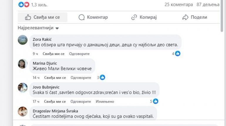 "Без обзира шта причају о данашњој деци, деца су најбољи део света", "Живео Мали Велики човече", "Честитам родитељима овог дјечака, који су га овако васпитали", "Понос својих родитеља", само су неки од комплимената које су корисници друштвених мрежа упутили Страхињи.