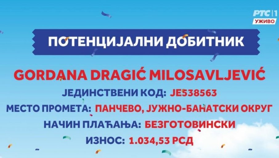 Извучен је алфанумерички код JE538563. Место промета рачуна је Панчево, а висина добитног рачуна је 1.034 динара. Рачун је плаћен безготовински.