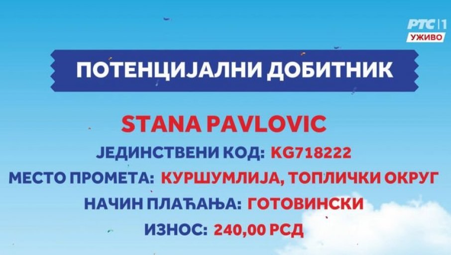 Извучен је алфанумерички кôд KG718222. Место промета рачуна је Куршумлија, а висина добитног рачуна је 240 динара. Рачун је плаћен готовински.