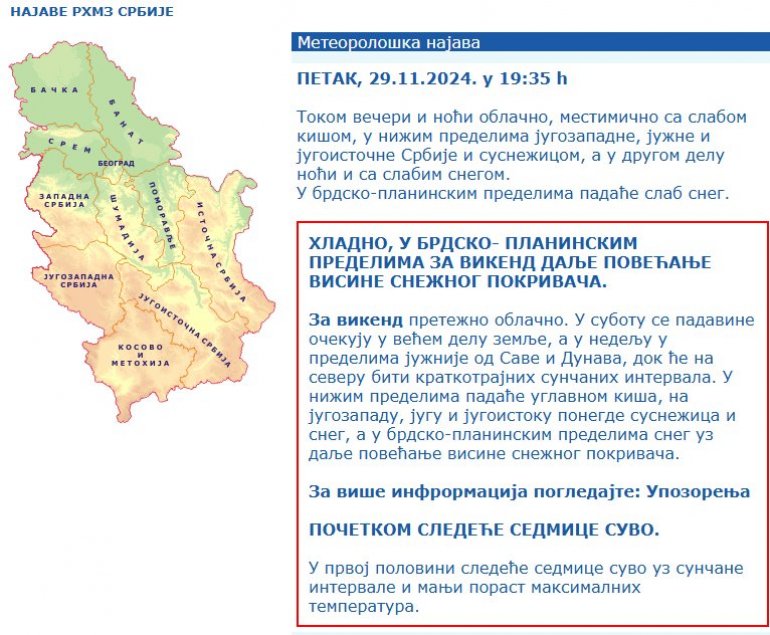 РЕПУБЛИЧКИ хидрометеоролошки завод огласио се на свом званичном сајту најновијим саопштењем.