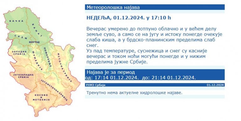 РЕПУБЛИЧКИ хидрометеоролошки завод огласио се на свом званичном сајту најновијим саопштењем.