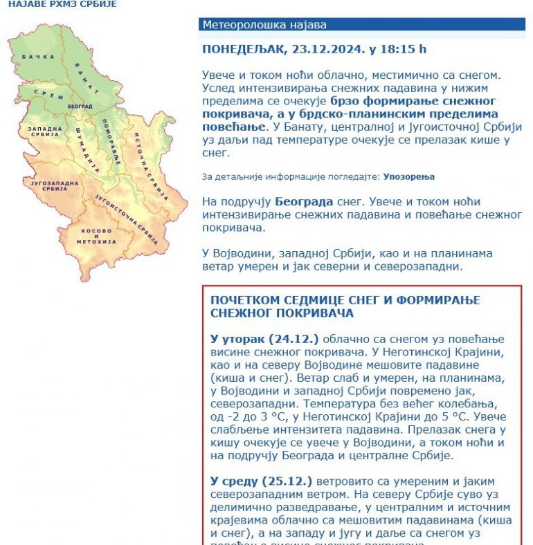 - Увече и током ноћи облачно, местимично са снегом. Услед интензивирања снежних падавина у нижим пределима се очекује брзо формирање снежног покривача, а у брдско-планинским пределима повећање. У Банату, централној и југоисточној Србији уз даљи пад температуре очекује се прелазак кише у снег.