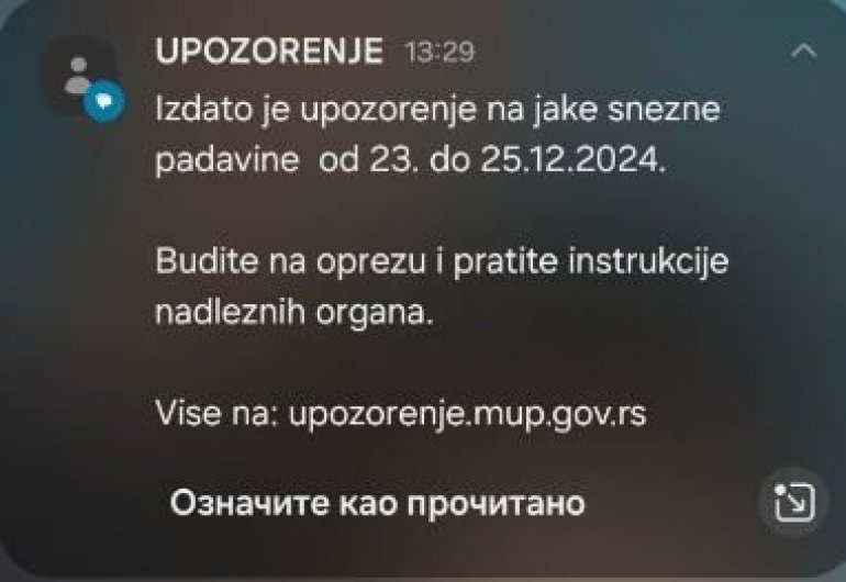 Додао је да грађани кад добију такву врсту упозорења треба да коригују своје понашање и да не крећу на пут без преке потребе, уколико је то могуће.