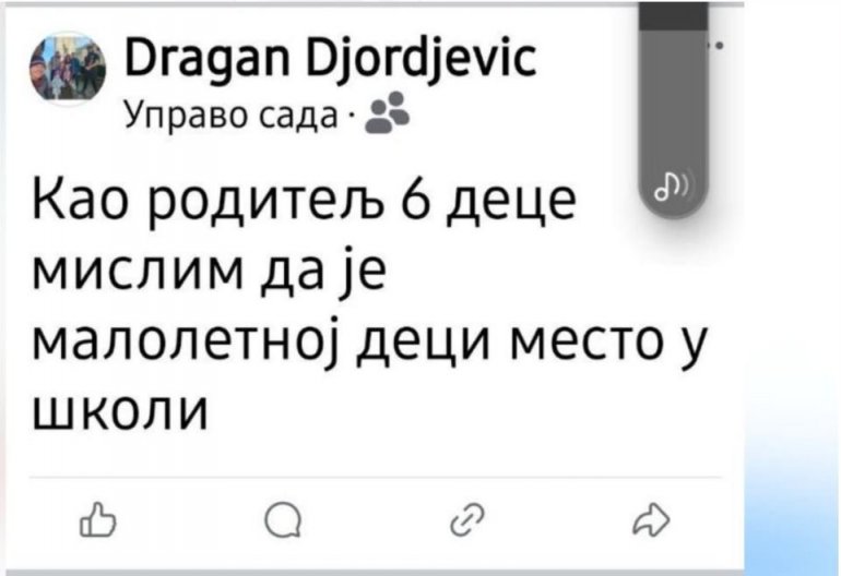 - Као родитељ шесторо деце, мислим да је малолетној деци место у школи - написао је један отац на друштвеној мрежи.