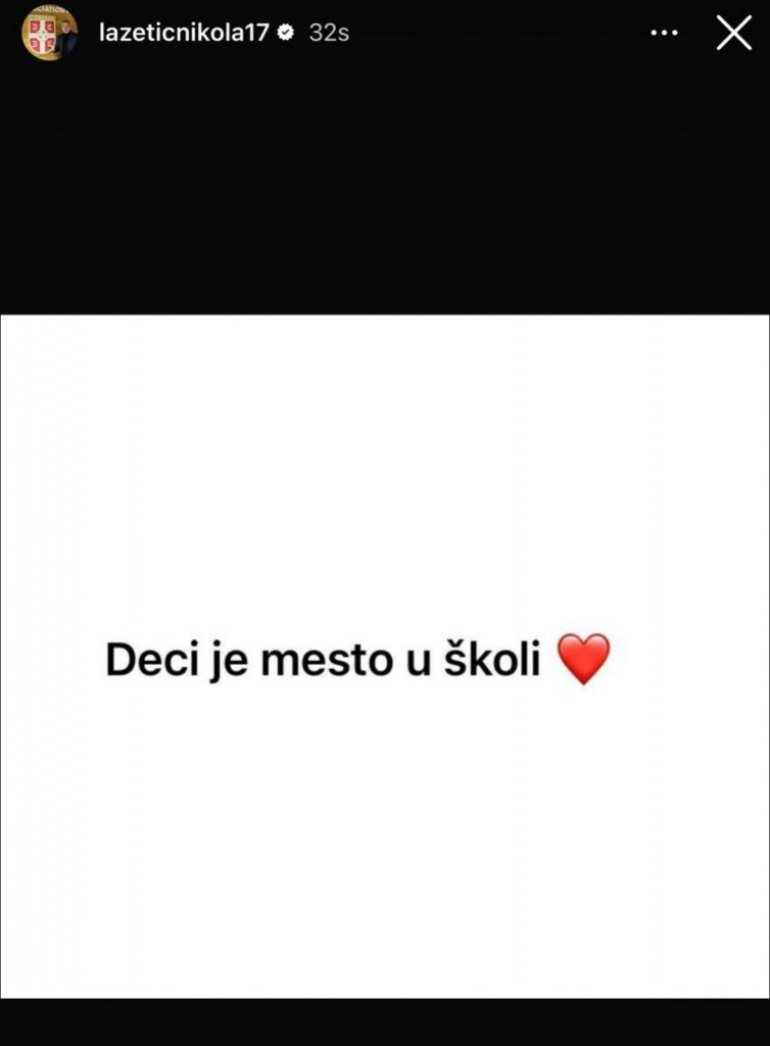 О СИТУАЦИЈИ која тренутно постоји у малом делу школа у Србији, као и притисцима који се стварају на родитеље и наставнике и отвореној злоупотреби деце у политичке сврхе, огласио се и фудбалер Никола Лазетић.