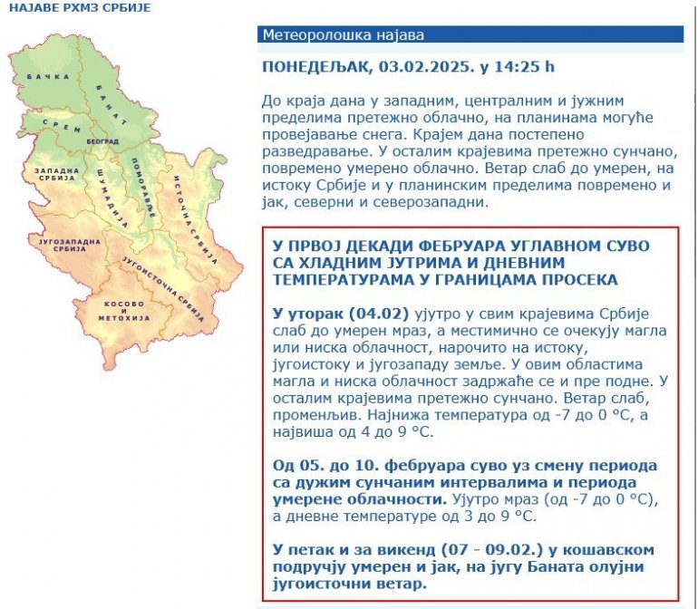 У уторак (04.02) ујутро у свим крајевима Србије слаб до умерен мраз, а местимично се очекују магла или ниска облачност, нарочито на истоку, југоистоку и југозападу земље. У овим областима магла и ниска облачност задржаће се и пре подне. У осталим крајевима претежно сунчано. Ветар слаб, променљив. Најнижа температура од -7 до 0 °С, а највиша од 4 до 9 °С.