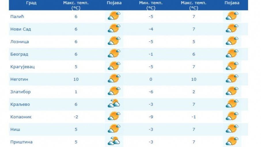 Током дана биће претежно сунчано и хладно, у Банату и источној Србији после подне умерено облачно. Дуваће слаб до умерен северозападни, на истоку повремено и јак ветар. Најнижа температура биће од -8 до -1 степен, а највиша од 4 до 7, у Тимочкој Крајини око 10 степени.