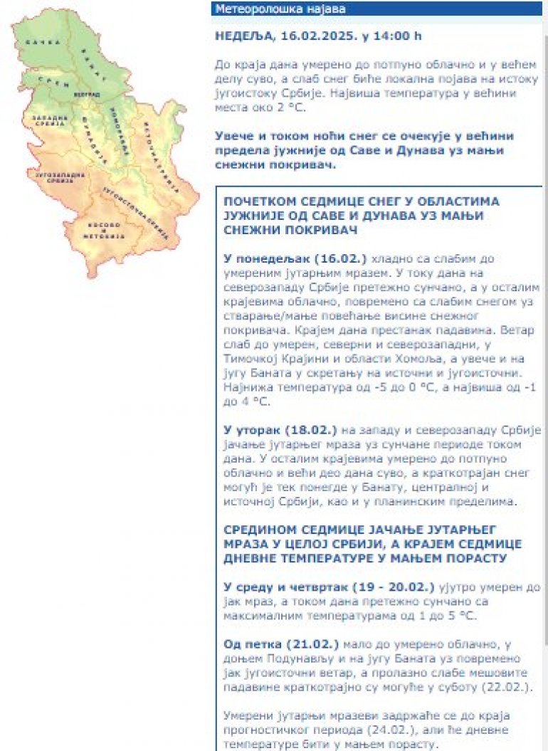 У понедељак (16.02.) хладно са слабим до умереним јутарњим мразем. У току дана на северозападу Србије претежно сунчано, а у осталим крајевима облачно, повремено са слабим снегом уз стварање/мање повећање висине снежног покривача. Крајем дана престанак падавина. Ветар слаб до умерен, северни и северозападни, у Тимочкој Крајини и области Хомоља, а увече и на југу Баната у скретању на источни и југоисточни. Најнижа температура од -5 до 0 °С, а највиша од -1 до 4 °С.