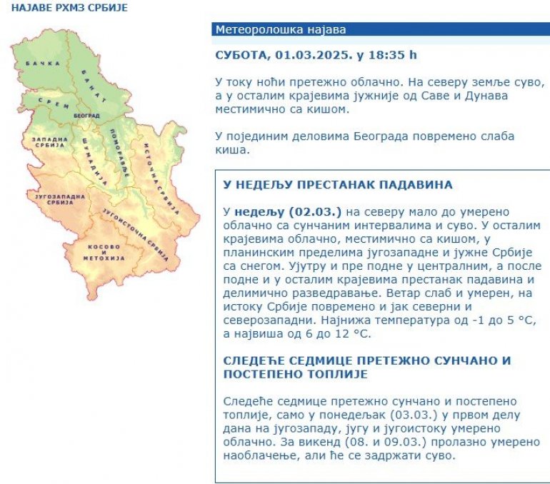 У недељу (02.03.) на северу мало до умерено облачно са сунчаним интервалима и суво. У осталим крајевима облачно, местимично са кишом, у планинским пределима југозападне и јужне Србије са снегом. Ујутру и пре подне у централним, а после подне и у осталим крајевима престанак падавина и делимично разведравање. Ветар слаб и умерен, на истоку Србије повремено и јак северни и северозападни. Најнижа температура од -1 до 5 °С, а највиша од 6 до 12 °С.