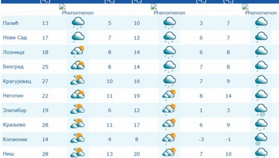 Дуваће ветар слаб и умерен западни и северозападни, у јужним пределима умерен и јак југозападни, а најнижа температура кретаће се од пет до 13 степени, док ће највиша бити од 10 степени на северу до 22 степена на југоистоку Србије.