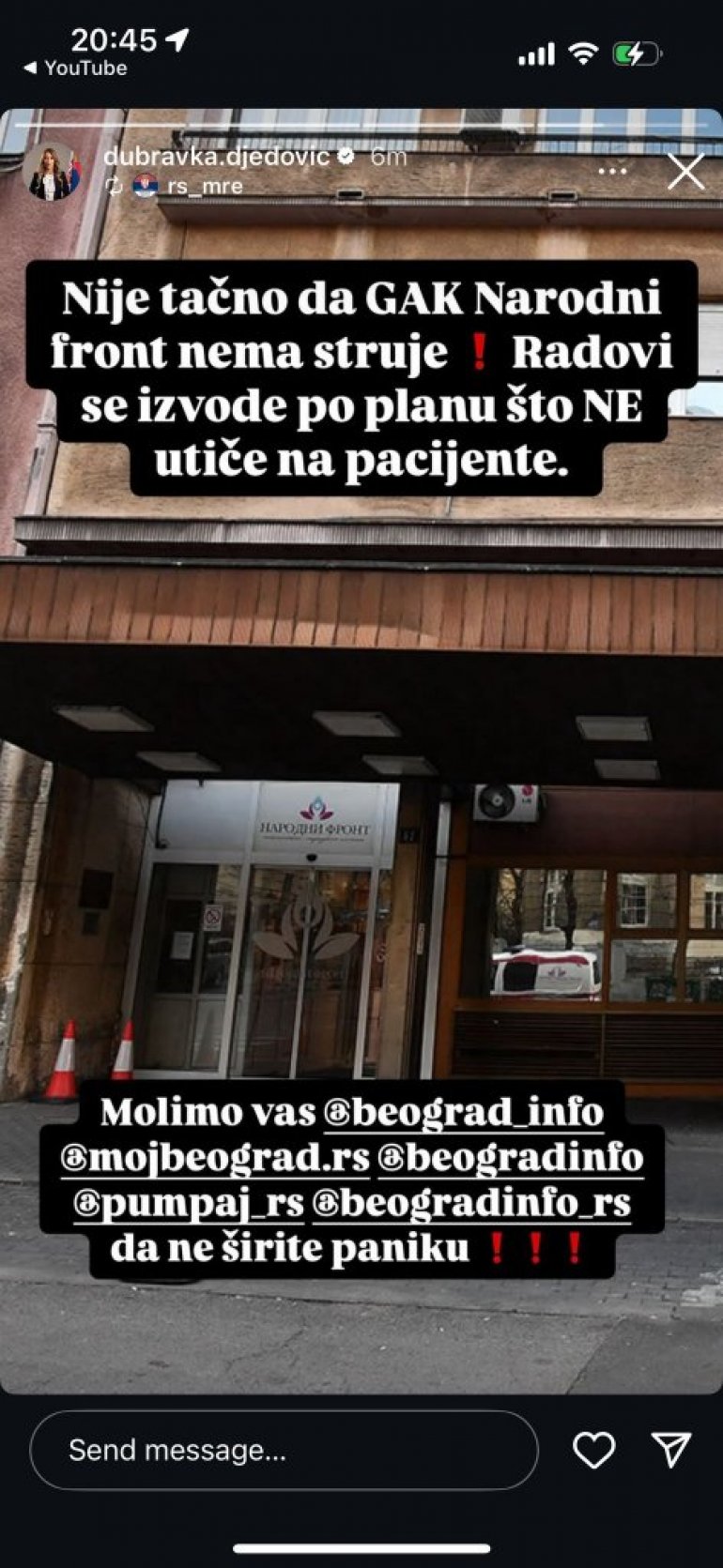 - Није тачно да ГАК Народни фронт нема струје. Радови се изводе по плану што не утиче на пацијенте. Молимо вас да не ширите панику - написала је Ђедовић Хандановић на Инстаграму.