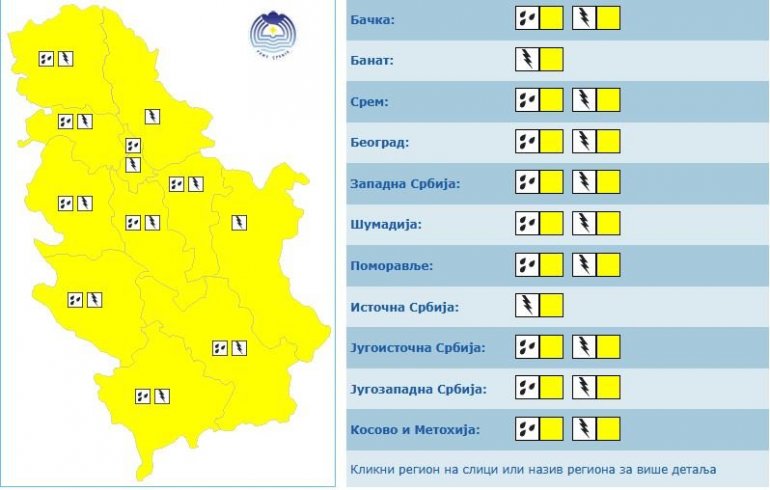 У среду је, такође, жути метеоаларм упаљен за целу Србију, а упозорење је на снази због грмљавине и кише.
