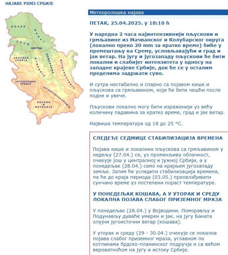 РЕПУБЛИЧКИ хидрометеоролошки завод огласио се на свом званичном сајту најновијим саопштењем.