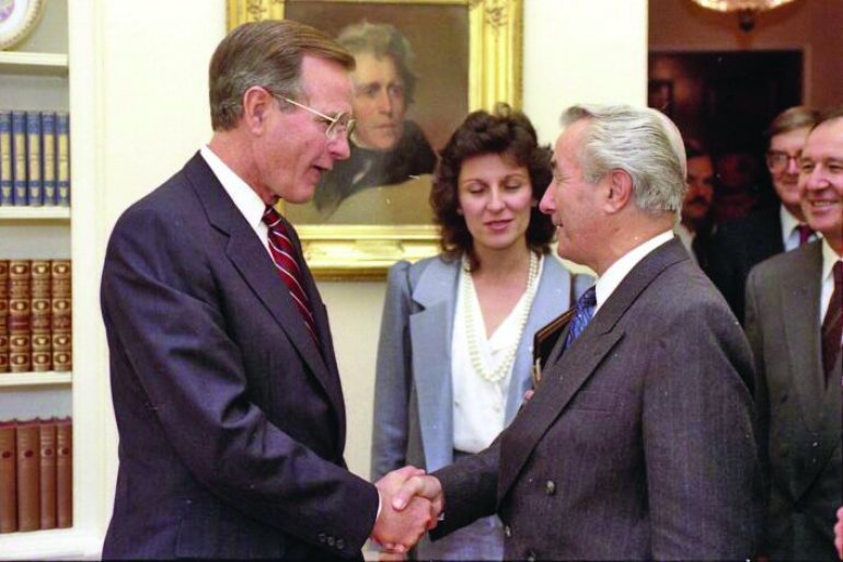 Џорџ Буш старији у Овалном кабинету Беле куће са премијером Антом Марковићем 13. октобар 1989.