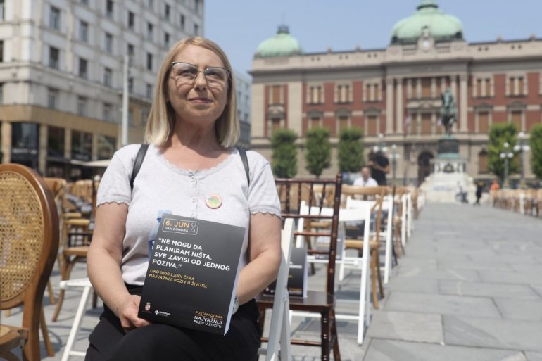 ИНСТАЛАЦИЈОМ 1800 столица на Тргу републике у Београду на којима седе пацијенти који чекају најважнији позив и на којима су њихове личне поруке које сведоче о тежини живота у неизвесности и нади у боље сутра обележен је 6. јун, Национални дан донора.