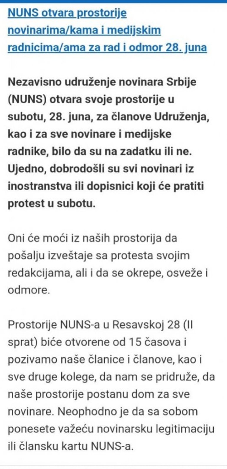 "Таквом одлуком, НУНС се не само сврстао на страну организатора дестабилизације и противуставног деловања, већ је и практично постао саучесник у покушају паралисања државе, под маском бриге за слободу медија. Никада до сада НУНС није показао ни трунку интереса да „отвори врата“ колегама у тренуцима важних и масовних догађаја од националног значаја – али им, изгледа, удобност и освежење новинара постају важне искључиво када је мета држава Србија.
