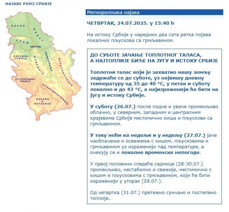Топлотни талас који је захватио нашу земљу задржаће се до суботе, уз највишу дневну температуру од 35 до 40 °С, у петак и суботу локално и до 43 °С, а најизраженији ће бити на југу и истоку Србије.