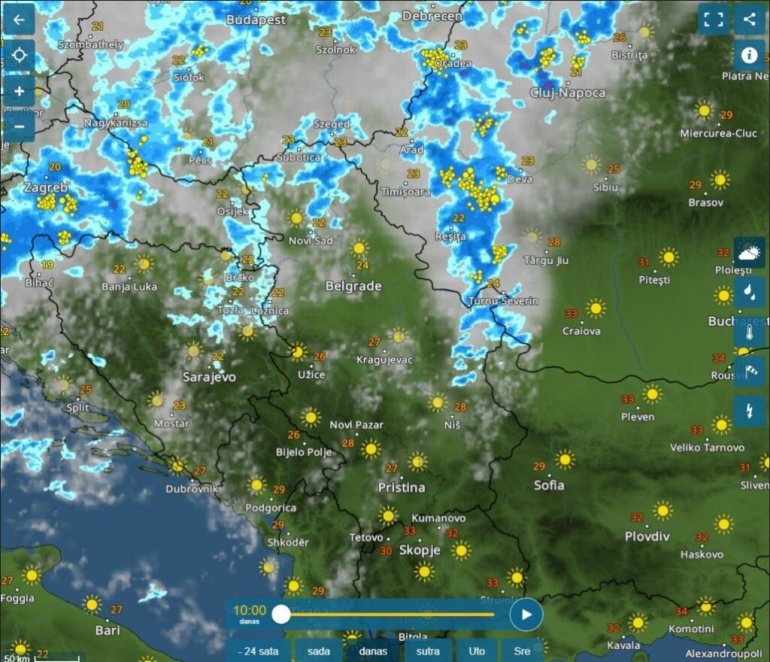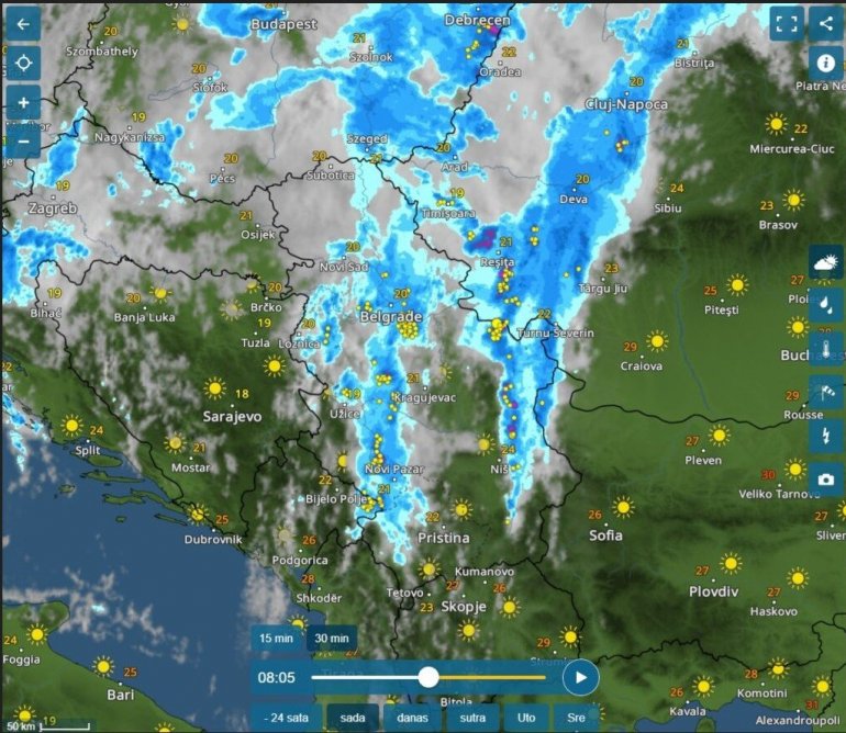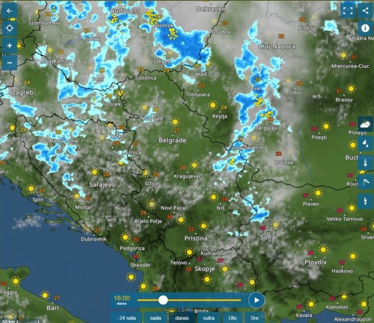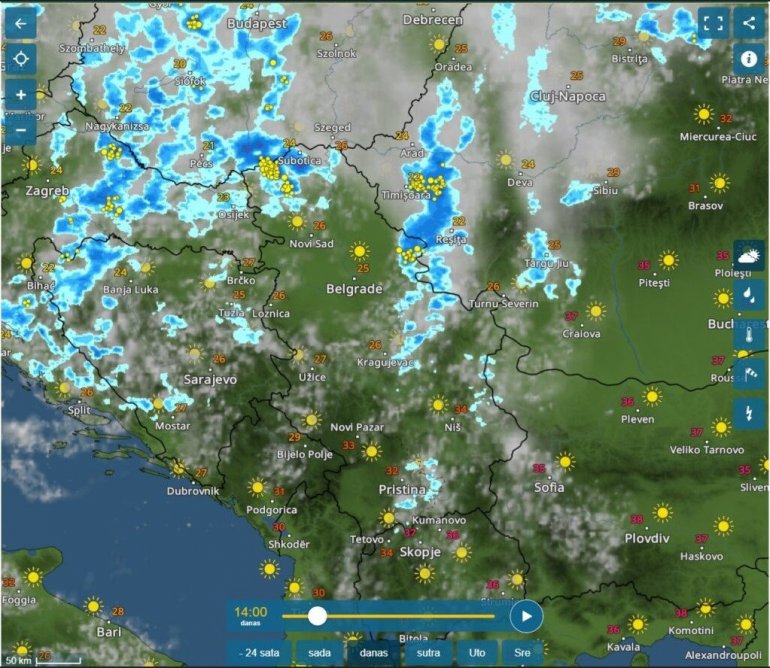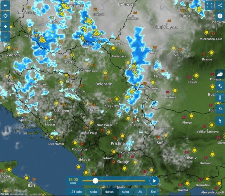 Данас (27.07.) на подручју Србије локално се очекују временске непогоде: обилни плјускови са грмлјавином, град и краткотрајно јак и олујни северозападни ветар у зони најинтензивнијих плјускова. На снази је упозорење на временске непогоде, а РХМЗ од ситних сати избацује хитна упозорења.