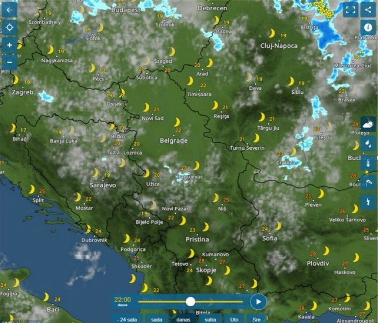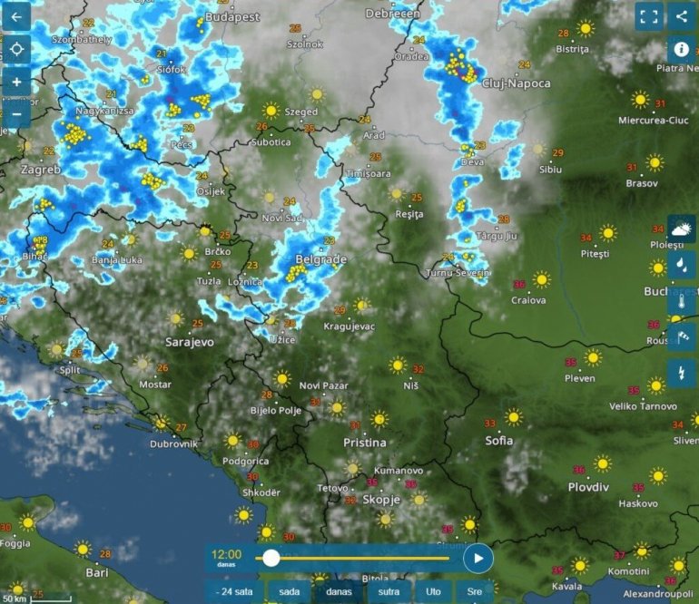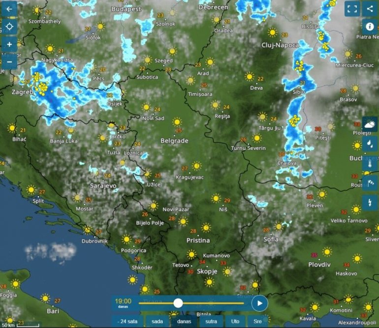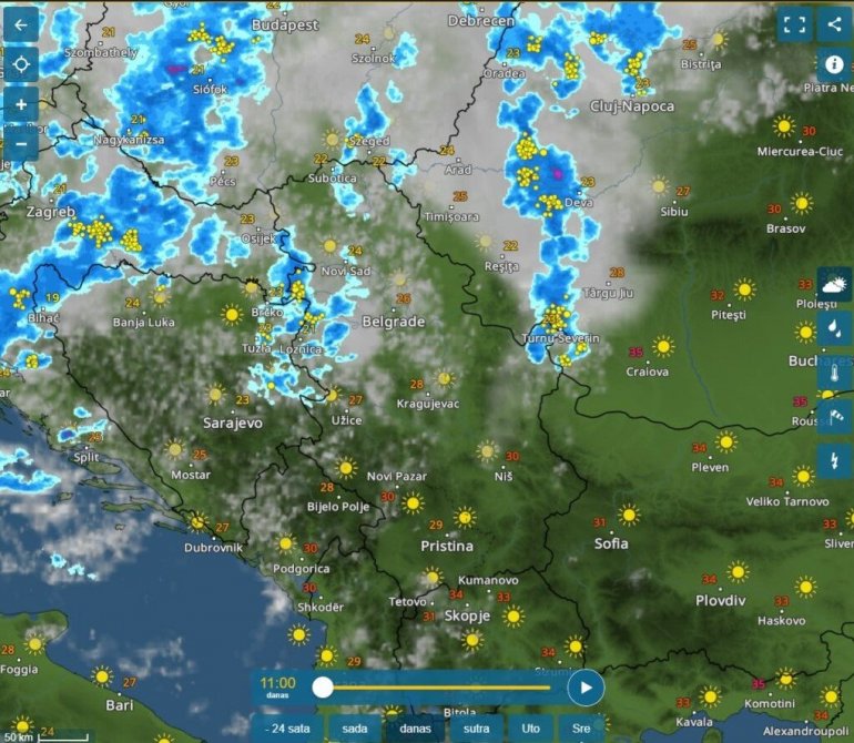 ПОСЛЕ најтоплијег дана у Србији од почетка лета, од данас, па све до краја јула, температуре кретаће се у интервалу од 25 до 30 степени Целзијусових. Снимци радара и кретања облака указују да ће данас у току дана највише кише пасти у 13 часова у централној и источној Србији. Све до 17х облаци ће се повлачити ка северу, а од 19х неће више бити падавина.
