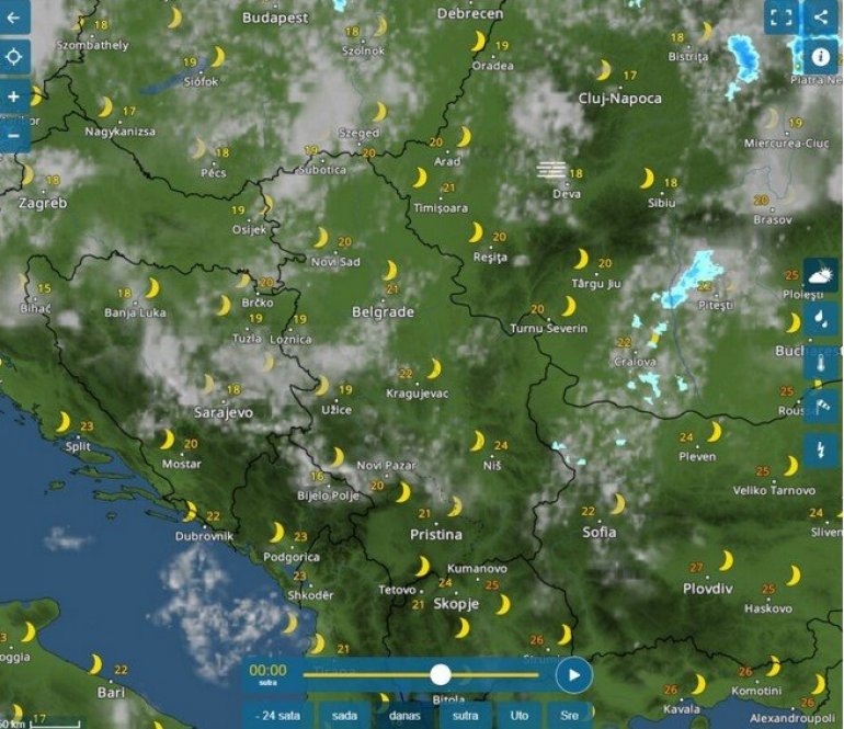 Биће променљиво облачно, осетно свежије и веома нестабилно са кишом, пљусковима и грмљавином. Локално се очекују и временске непогоде праћене обилним пљусковима, градом и краткотрајно јаким и олујним ветром у зони најинтензивнијих пљускова. Ветар умерен и јак, западни и северозападни. Јутарња температура од 19 до 24 степени, а највиша дневна од 25 на северозападу до 33 степени на југу и југоистоку. Највиша дневна температура од 25 на северозападу до 33 °С на југу и југоистоку земље, наводи у саопштењу РХМЗ.