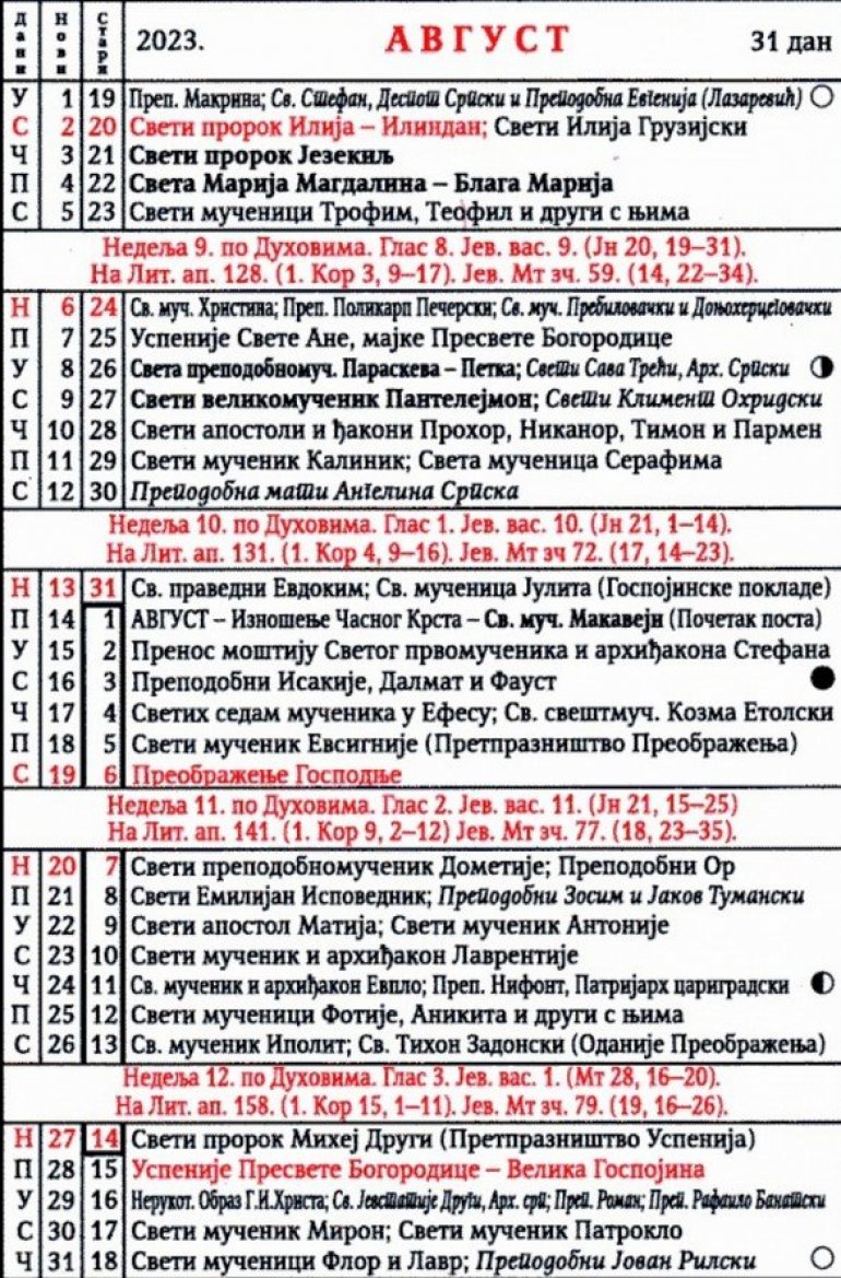 Црквени календар за август 2023. године са свим датумима је важан за све православне вернике. Током следећег месеца се прослављају 3 велика празника која су у црквеном календару обележени црвеним словом.