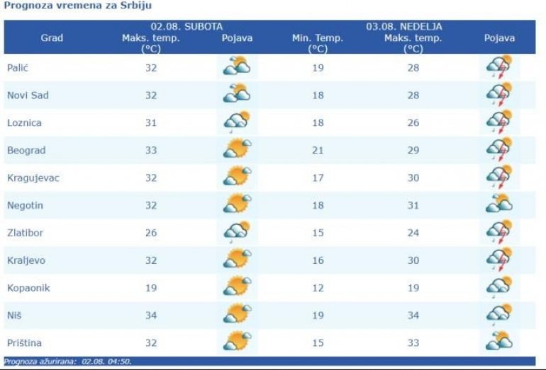 "Плјускови и грмлјавине који се на подручју Србије очекују у неделју после подне и увече, 3. августа, углавном у северним и западним, а током ноћи и у понеделјак, 4. августа, у осталим крајевима, локално ће бити праћени градом, јаким или олујним ветром и великом количином падавина за кратко време", упозорио је РХМЗ.