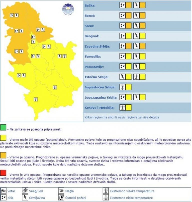 РЕПУБЛИЧКИ хидрометеоролошки завод упозорио је на јаке временске непогоде које се очекују у Србији.