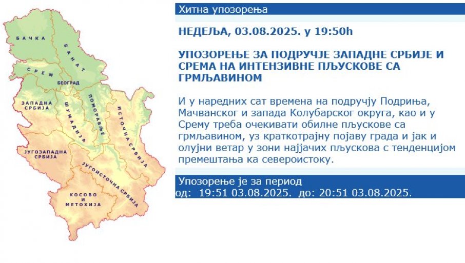 РЕПУБЛИЧКИ хидрометеоролошки завод издао је вечерас хитно упозорење вечерас на интензивне пљускове са грмљавином за подручје Западне Србије и Срема.