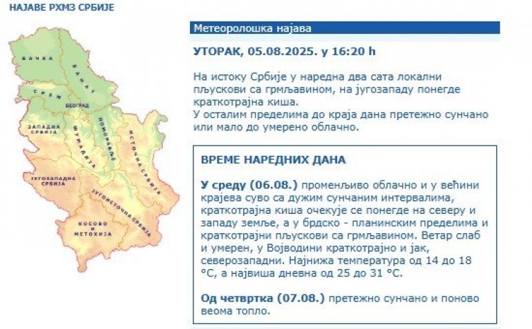 У среду (06.08.) променљиво облачно и у већини крајева суво са дужим сунчаним интервалима, краткотрајна киша очекује се понегде на северу и западу земље, а у брдско - планинским пределима и краткотрајни пљускови са грмљавином. Ветар слаб и умерен, у Војводини краткотрајно и јак, северозападни. Најнижа температура од 14 до 18 °С, а највиша дневна од 25 до 31 °С.