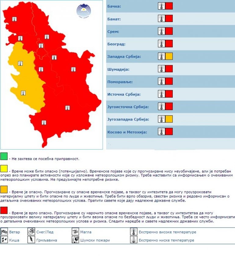 Само у понедељак и уторак на северу, западу и у делу централне Србије температуре ће бити нешто ниже и кретаће се у интервалу од 31 до 33 степена.
