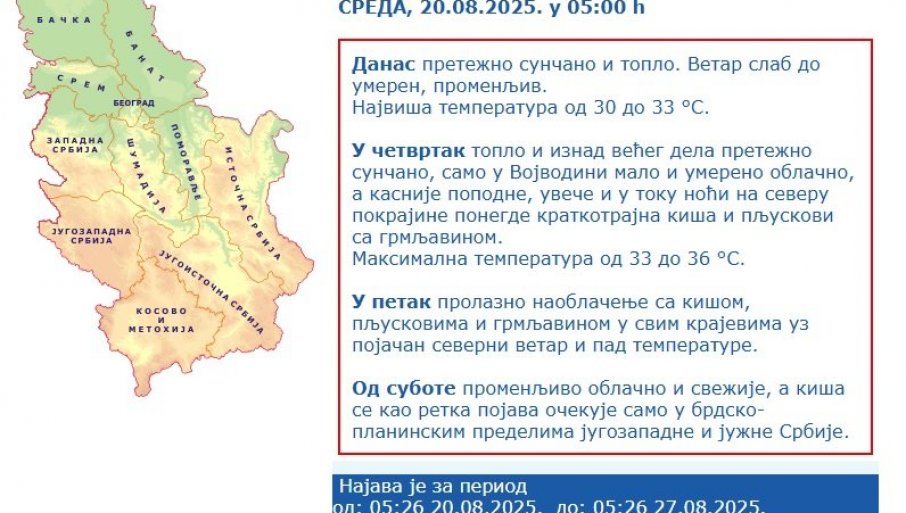 У четвртак топло и изнад већег дела претежно сунчано, само у Војводини мало и умерено облачно, а касније поподне, увече и у току ноћи на северу покрајине понегде краткотрајна киша и плјускови са грмлјавином.