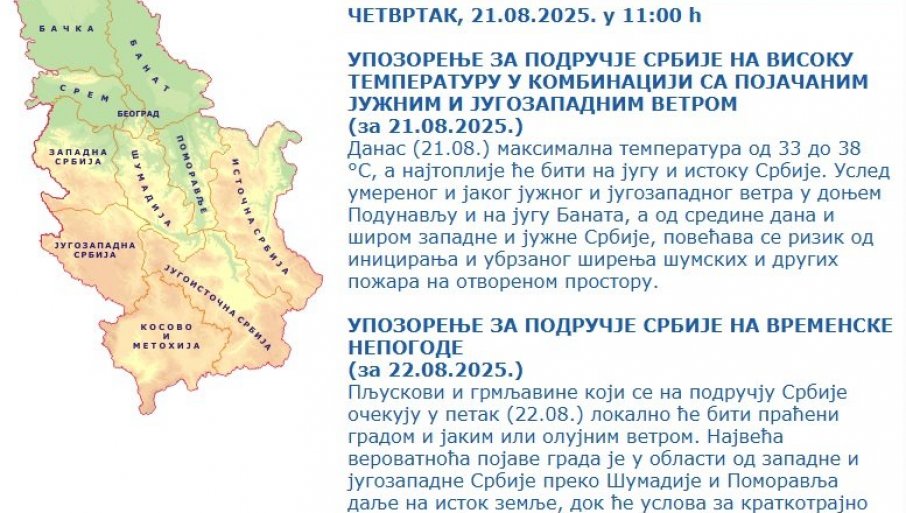 -Пљускови и грмљавине који се на подручју Србије очекују у петак локално ће бити праћени градом и јаким или олујним ветром. Највећа вероватноћа појаве града је у области од западне и југозападне Србије преко Шумадије и Поморавља даље на исток земље, док ће услова за краткотрајно јак или олујни ветар бити и северније и јужније од ове области. За конкретне локације издаваће се хитна упозорења један до два часа унапред- упозорио је РХМЗ.