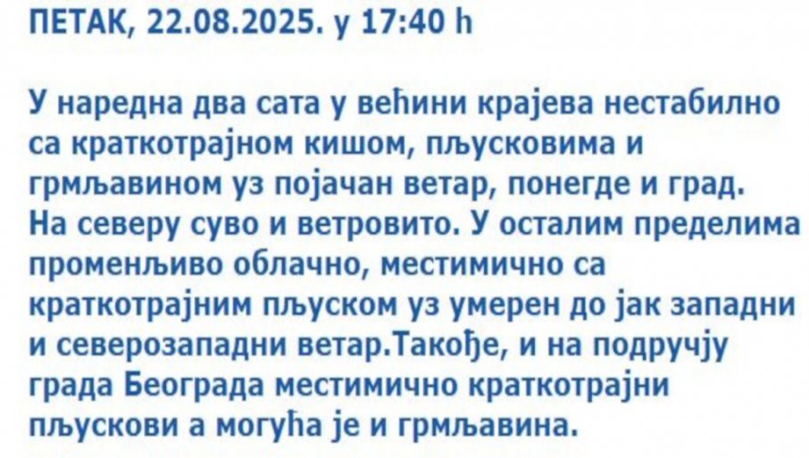 "У наредна два сата у већини крајева нестабилно са краткотрајном кишом, пљусковима и грмљавином уз појачан ветар, понегде и град. На северу суво и ветровито.