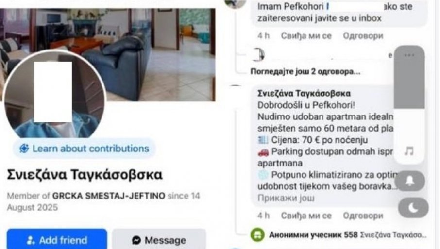 - Иста особа поново покушава са новим профилом и старим триковима. Како препознати: Профил новијег датума, мало пријатеља и објава. Нема доказа о смештају (реалне фотке, локација, рецензије). Тражи аконтацију или уплату унапред мимо сигурних канала, најсигурније преко банковних рачуна, са сликом пасоша или личне карте. Пожурује вас и нуди "специјалну цену“ само "данас“, ниска цена за одређене услове - наводи се у упозорењу администратора ове групе.