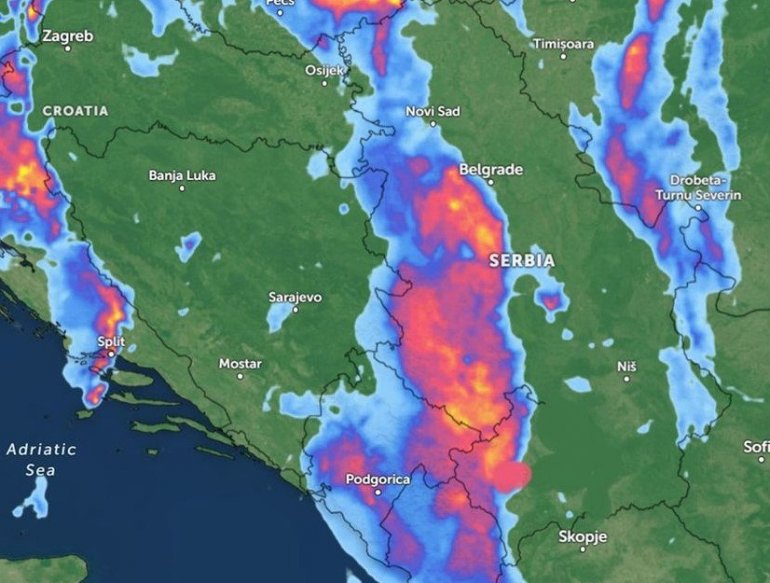 СРЕДИНОМ дана хладни фронт са кишом, пљусковима и грмљавином стигао је до југозападних, западних и северозападних делова Србије и сада се преко Подриња и Колубарског округа премешта према централним пределима, према Мачви, Београду, Шумадији, Поморављу, Банату и Подунављу.