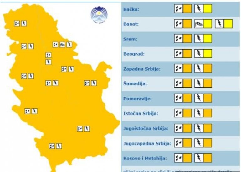 Како наводи РХМЗ, наранџасти метеоаларм је на снази за целу Србију, а за конкретне локације издаваће се хитна упозорења сат до два унапред.
