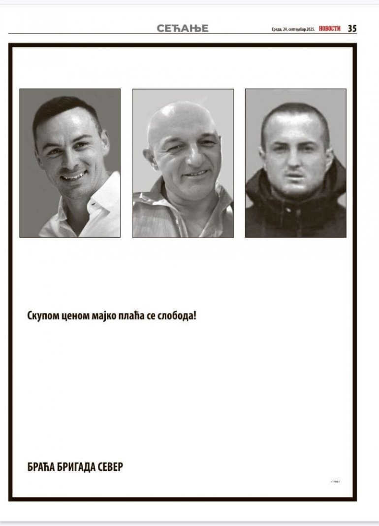 "Скупом ценом мајко плаћа се слобода" наводи се у читуљи објављеној у " Вечерњим новостима", коју потписују Браћа бригада север.