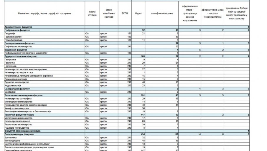 - Рударско-геолошки факултет (165 буџетских и 62 самофинансирајућа)
