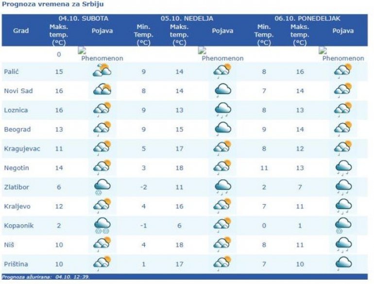 - У недељу ново пролазно облачење поново крајем дана, а у понедељак пре подне падаће киша. Отопљење постепено креће од среде, четвртка, у другој половини следеће недеље. Следећи петак температура ће опет бити око 20 степени, дакле, нормална је за ово доба године, а удругој декади октобра креће и Михојско лето, то ће бити температура између 20 и 25 степени.