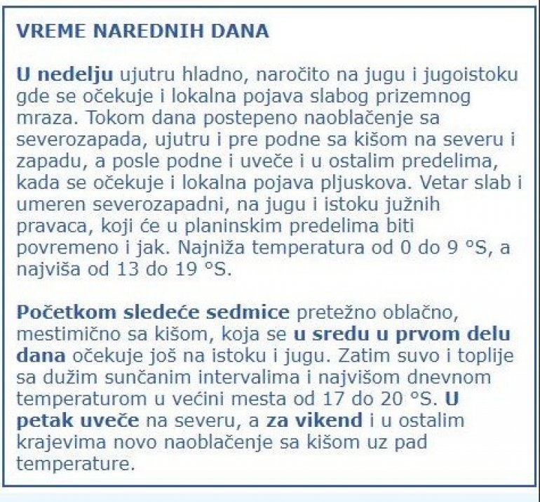 - У неделју ујутру хладно, нарочито на југу и југоистоку где се очекује и локална појава слабог приземног мраза. Током дана постепено наоблачење са северозапада, ујутру и пре подне са кишом на северу и западу, а после подне и увече и у осталим пределима, када се очекује и локална појава плјускова. Ветар слаб и умерен северозападни, на југу и истоку јужних праваца, који ће у планинским пределима бити повремено и јак. Најнижа температура од 0 до 9, а највиша од 13 до 19 степени.