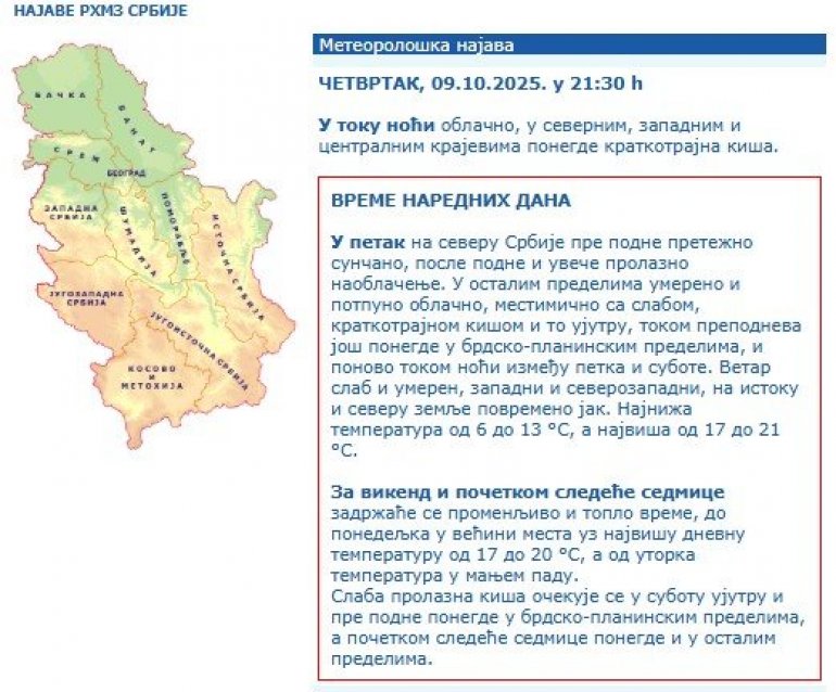 У петак на северу Србије пре подне претежно сунчано, после подне и увече пролазно наоблачење. У осталим пределима умерено и потпуно облачно, местимично са слабом, краткотрајном кишом и то ујутру, током преподнева још понегде у брдско-планинским пределима, и поново током ноћи између петка и суботе. Ветар слаб и умерен, западни и северозападни, на истоку и северу земље повремено јак. Најнижа температура од 6 до 13 °С, а највиша од 17 до 21 °С.