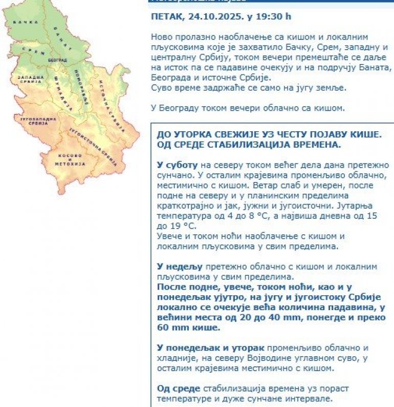 - Ново пролазно наоблачење са кишом и локалним пљусковима које је захватило Бачку, Срем, западну и централну Србију, током вечери премештаће се даље на исток па се падавине очекују и на подручју Баната, Београда и источне Србије. Суво време задржаће се само на југу земље.