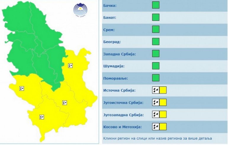 За уторак, 18. новембра упаљен је жути метеоаларм у источној, југоисточној, југозападној и јужној Србији због пљускова.