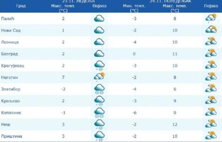 Понедељак ће ујутро донети мраз и врло хладно време, са минималном температуром од -5 до 0°Ц. Током дана биће умерено облачно, суво и мало топлије, са температуром и до 10 °Ц. Увече на северу и западу, а током ноћи и у осталим крајевима стиже ново наоблачење са кишом.