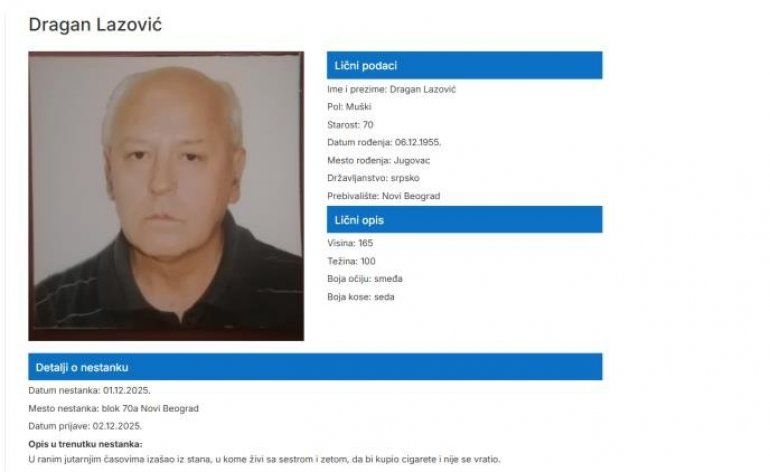 ДРАГАН Лазовић из Новог Београда нестао је у уторак 2.12.2025. у Блоку 70а, након што је у раним јутарњим часовима изашао до оближњег киоска по цигарете, одакле се није вратио.
