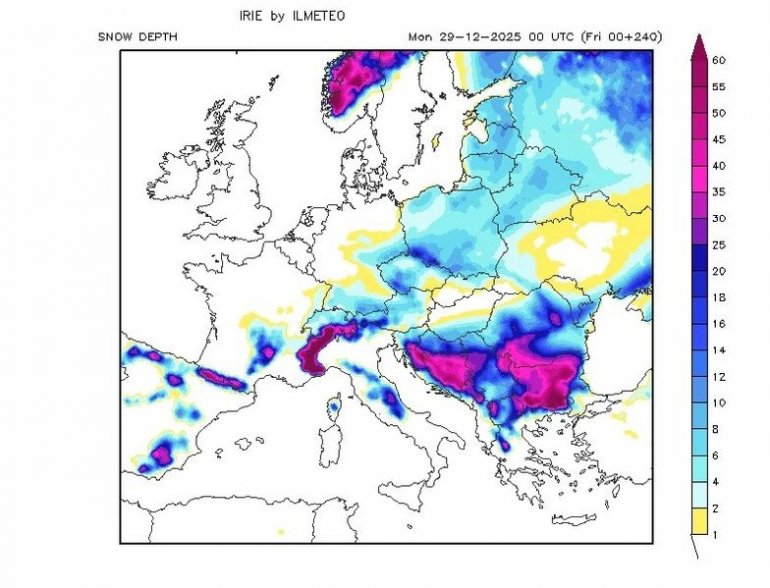 - Око 24.12. би се поље антициклона уз даље јачање требало ситуирати негде у област између запада Скандинавије и Велике Британије те би по источној периферији овог система почело повлачење хладног ваздуха са истока и североистока Русије. Од тачне снаге и положаја циклона над Медитераном ће у великој мери зависити и снага тог хладног продора као и његова брзина, али око 27.12. већина релевантних модела над Европом симулира праву зимску синоптику и снег би био могућ и у низијама - напомиње он.