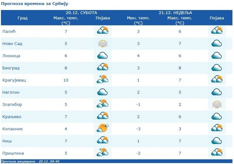 У недељу и понедељак у већем делу облачно и магловито, на истоку Србије понегде са сипећом кишом, док се периоди сунчаног времена очекују само на високим планинама јужне Србије.