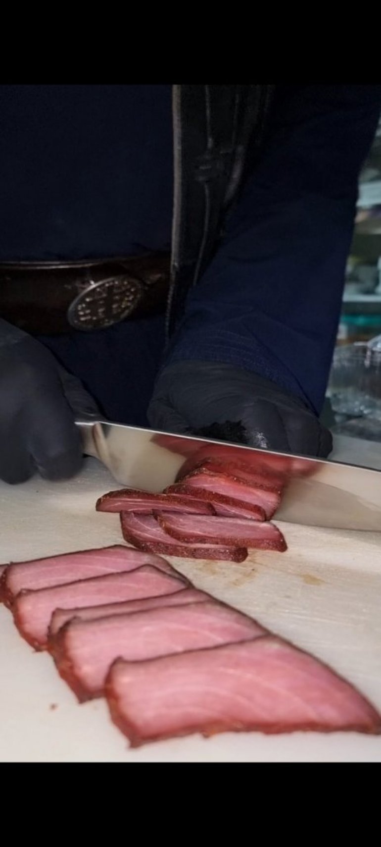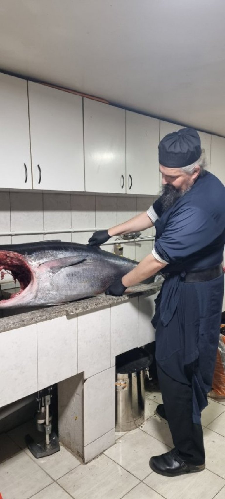 - Од нашег добављача набављамо сашими туну која је већ исечена, филетирана, у њој нема костију, нема коже, нема масних ткива, код туне се масноћа углавном налази на трбушном делу, док на леђном нема и једино што може да се деси је то неко раслојавање у самом ткиву и то баш због тога што нема те масноће која би повезивала. Сам процес се састоји од тога да када припремамо рибу исечемо је на неке одговарајуће дебљине, комаде, затим то стављамо у мешавину зачина коју ми сами правимо и то по некој рецептури коју смо сами током година, у ранијим манастирима из искуства видели да нам највише одговара. У томе стоји 24 сата, они већи комади стоје 48 сати а након тога тек креће сам процес сушења, ми користимо суво буково дрво и пар пута додајемо дрво од суве шљиве. Углавном туна стоји недељу дана на сушењу, а раније у манастиру Драча, када смо правили ексклузивније комаде који нису сечени они су стављали око два чак и три месеца, као шунке. Пар пута смо сушили и сабљарку, али код нас је нема редовно на тржишту, па је онда незгодно да је имамо у понуди, а да не можемо да задовољимо потребе купаца. Планирамо да проширимо производњу и правимо рибље кобасице - казао је архимандрит Онуфрије.